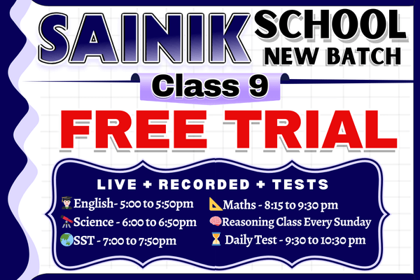 Join our Sainik School Class 9 Free Trial - LIVE Class to experience our interactive teaching methods and insightful explanations. Get access to our Daily LIVE Classes and Tests for 1 days to assess our approach to teaching and learning. Don't miss this opportunity to enhance your understanding and excel in your academic pursuits.